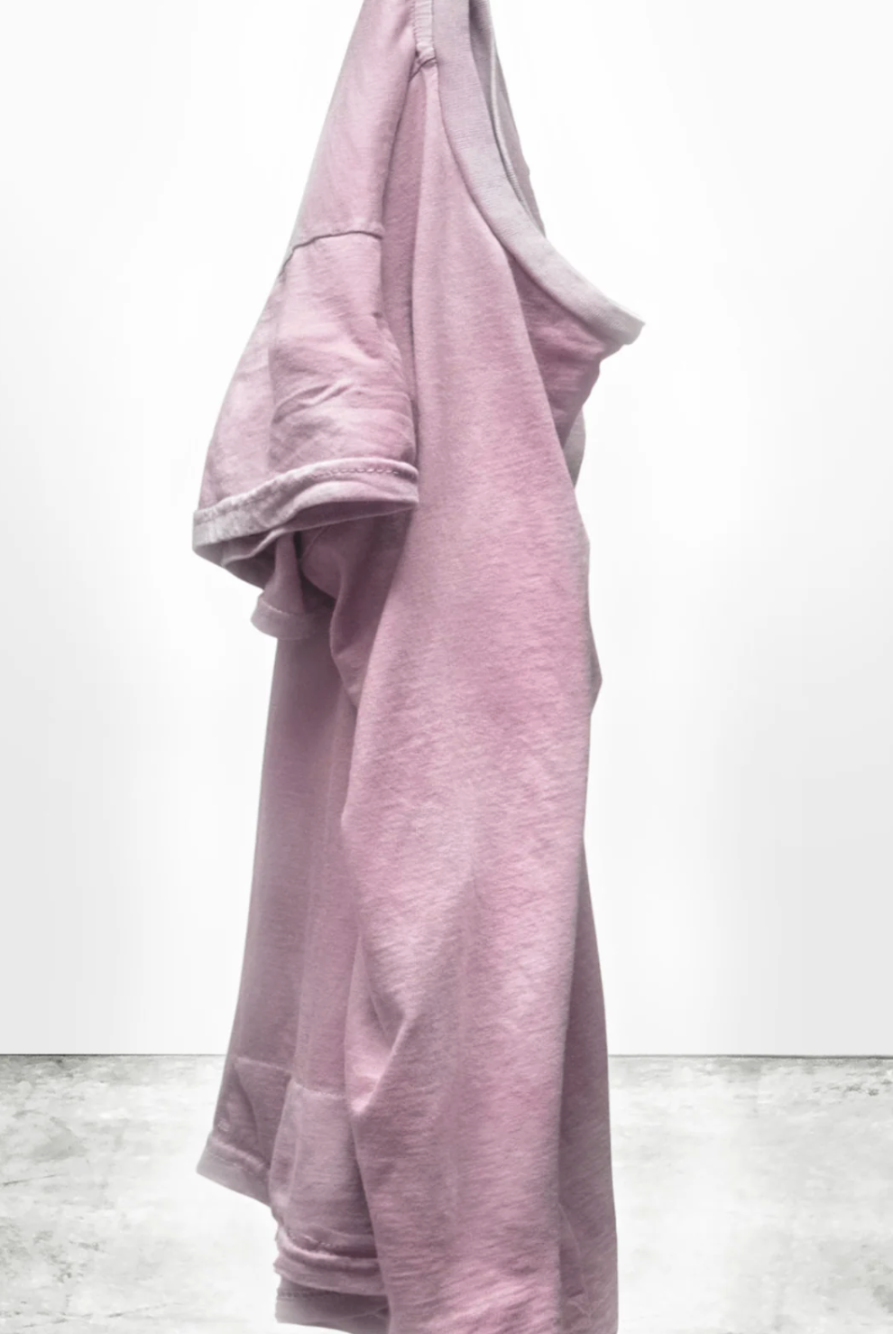 Supersoft unisex HOMAGE shortsleeve t. in ballerina powder with custom sunfade dye process (highs and lows) custom hand-screenprinted "CALIFORNIAKID" label and HAND/grinding (distressing) details on neck rib and hem. Slim fit with supersoft hand feel.