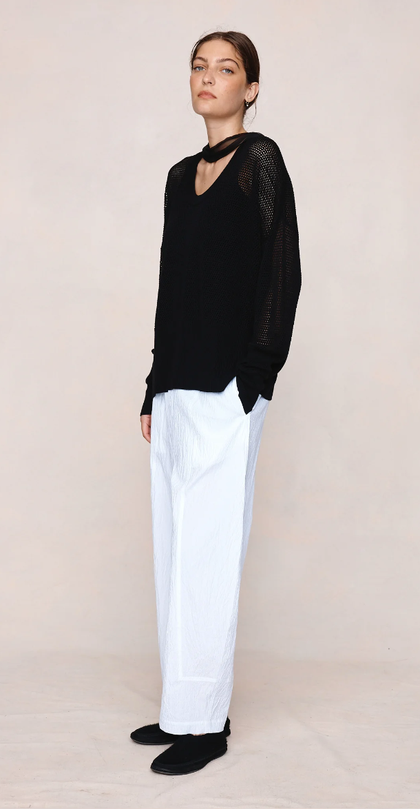 Semi-sheer open-knit jumper with a relaxed fit, scoop neckline, dropped shoulders, and ribbed hem and cuffs, accompanied by a silk scarf.