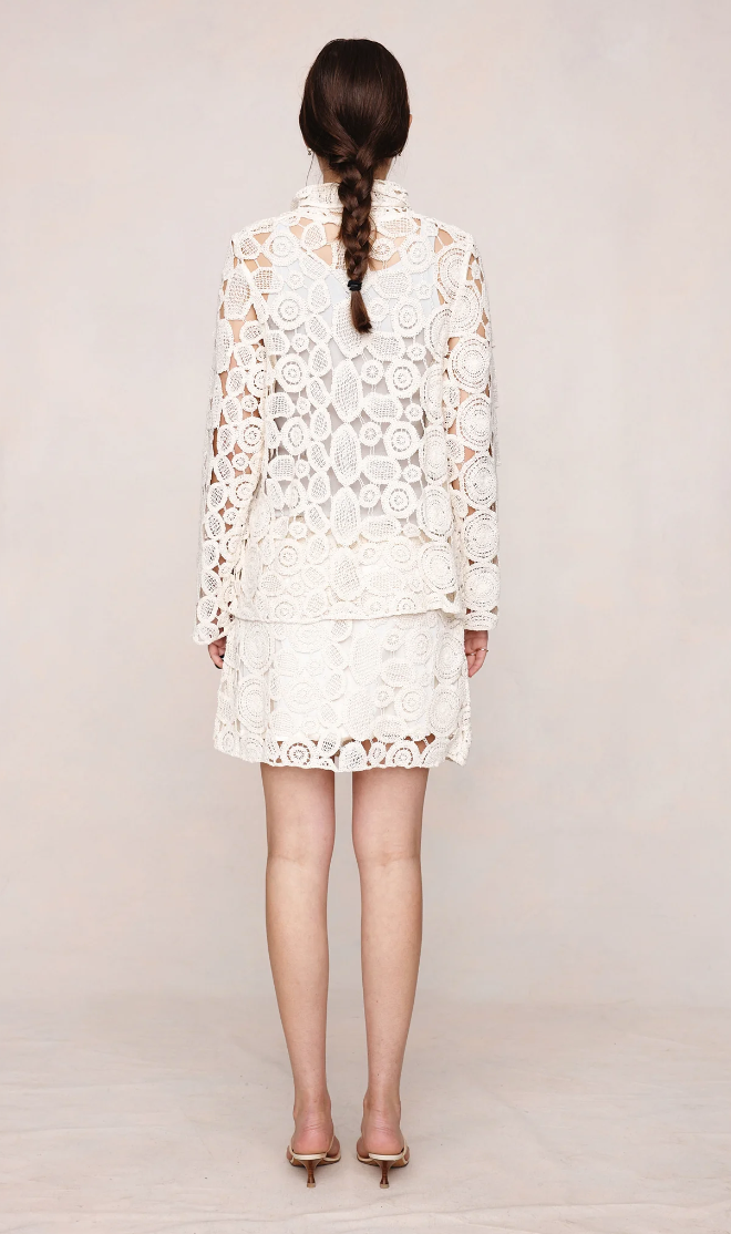 The Pierre top intricately worked in 100% cotton crochet lace, shaped by spiralled motifs and a soft, textual hand feel. A relaxed, slightly boxy fit, pointed collar, button-through front, full-length sleeves, and an unlined construction